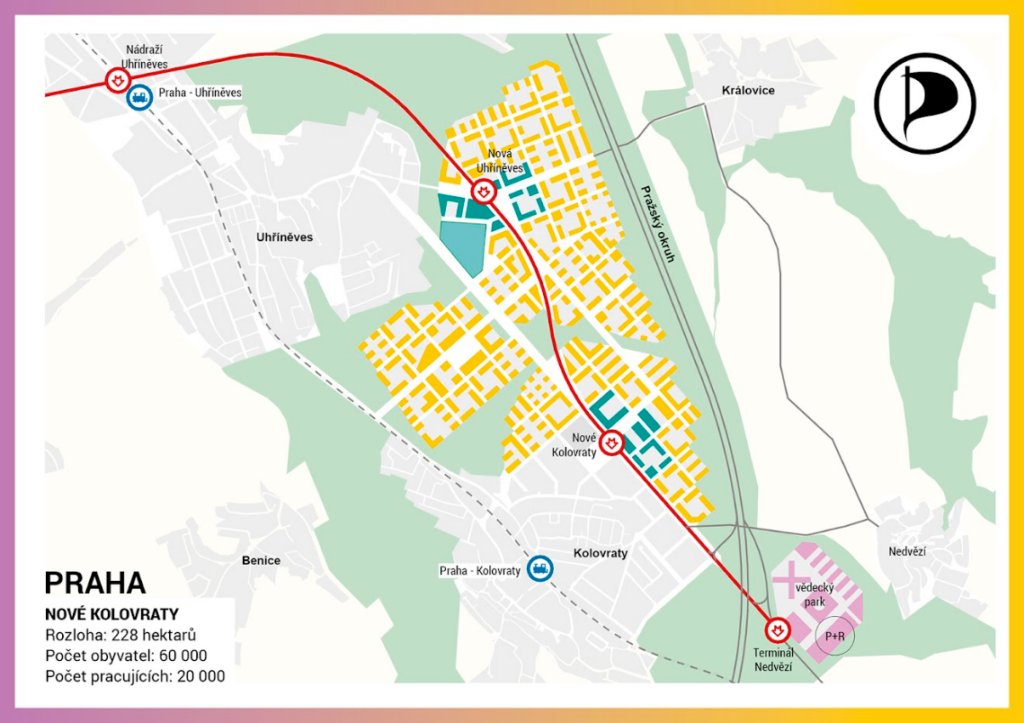 Podle informací zveřejněných samotnými Piráty, mají nově plánované čtvrti pracovní názvy Nové Kolovraty, Východní město a Západní město. Podle informací přímo od Pirátů zde plánují bydlení pro nových 200 tisíc obyvatel v 80 tisících bytech a pracovních lokalit pro 70 tisíc lidí na 650 hektarech území.